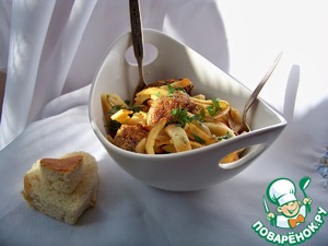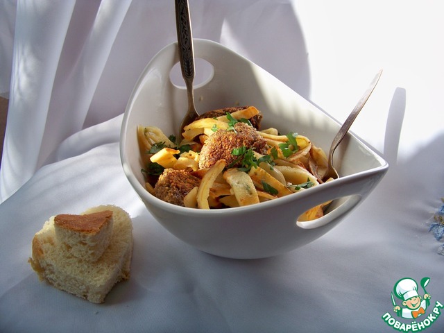 Фритате - это жареная лапша из блинного теста. Вот такое блюдо Жареная лапша с клёцками из печенки хочу предложить вам, дорогие друзья! Рецепт этого блюда я нашла в кулинарной книге Карапанджи (хорватского кулинара) Немного изменила под свой вкус. Готовится блюдо несложно, а результат порадует Вас сытостью и приятным вкусом. Это блюдо хочу приподнести моей замечательной, очаровательной Светланочке (Lanka F) Надеюсь, ей понравится мой скромный, но очень вкусный подарок!