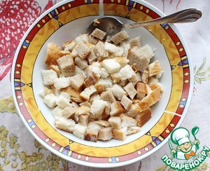 Батон нарезать небольшими кубиками и залить горячей водой.