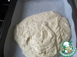 Выкладываем на противень с пергаментной бумагой. Разравниваем и тесто должно быть тонкое, т. к. оно еще поднимется. Если положить толстым слоем, то при сворачивании рулет будет трескаться. Форма 38 см на 18 см.