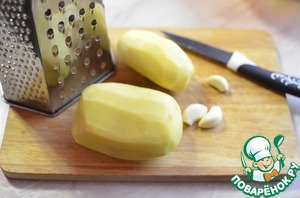 Картофель натереть на крупной терке, чеснок натереть на средней или выдавить через пресс.