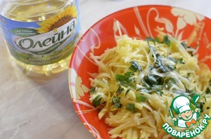 В миске соединить зелень, тертый картофель, чеснок, добавить муку, воду, соль, специи и подсолнечное масло. Хорошо перемешать.