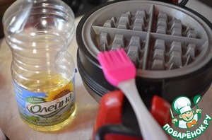 Вафельницу разогреть. Я подстраховалась и смазала ее подсолнечным маслом.