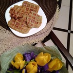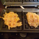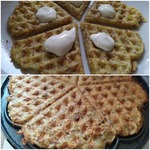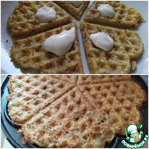 Тонкие картофельные вафельки получаются)).Воду не добавляла.Выпекаются за минуту в моей вафельнице).Добавила в тесто тертый сыр.Не прилепают.