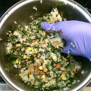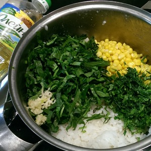 К отварному рису отправляем нарезанный мелко шпинат, укроп, петрушку, раздавленный чеснок и кукурузу. Все перемешиваем.