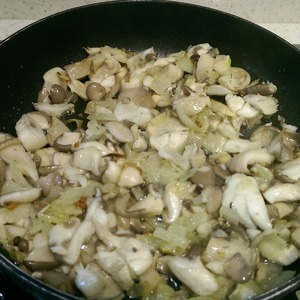 А пока жарятся котлетки, займемся грибным соусом. На другой сковороде на растительном масле обжариваем до золотистости репчатый лук, после добавляем нарезанные свежие грибы. У меня вешенки, но подойдут любые, имеющиеся в наличии. Жарим до испарения жидкости с грибов.