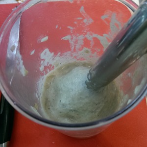 Отправляем обжаренные грибы с луком в чашу блендера и измельчаем до пюреобразного состояния, при необходимости добавляем немного воды. Консистенция соуса как у майонеза или нежирной сметаны.