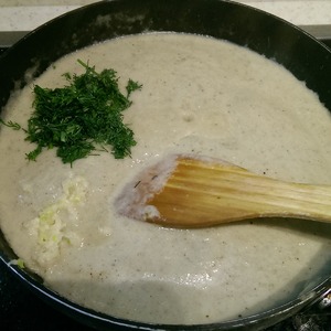 Отправляем наш соус обратно в сковороду, добавляем соль, перец, чеснок и мелко нарезанный укроп. Провариваем несколько минут, чтобы соус вобрал в себя все ароматы.