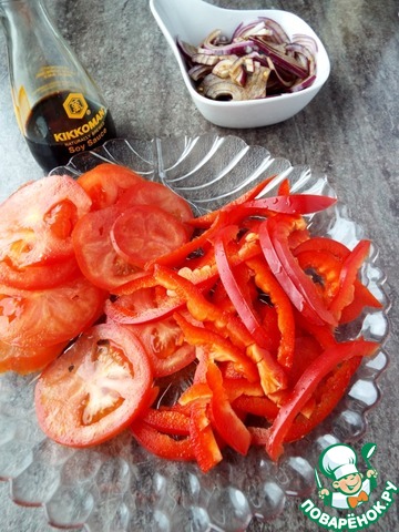 Помидор нарезать кружочками, перец - тонкими полосками.