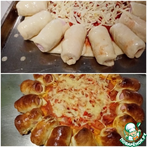 Выложить сосиску в тесте по краю пиццы швом вниз.