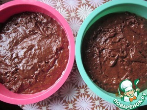 Добавить растительное масло и воду. Перемешать, выложить в формы. Я выпекаю в двух, но можно и в одной испечь, а потом разрезать на два коржа. Размер моей формы 21 см. Выпекаем в духовке 180* 25-30 минут. Готовые коржи нужно остудить.