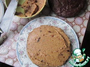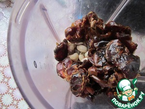 Пока коржи остывают готовим крем. В блендер кладем орехи и финики, немного воды. Взбиваем, понемногу добавляя воду до нужной кремообразной консистенции.