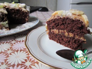 Собираем торт, промазываем между коржами и верх торта кремом и украшаем фруктами. Я украсила бананами и киви. Еще я посыпала торт кокосовой стружкой. Поставьте торт на ночь в холодильник, хоть это можно и пропустить)))