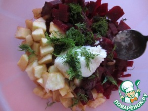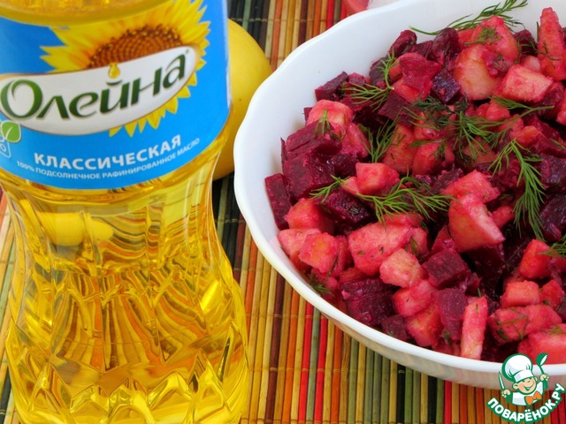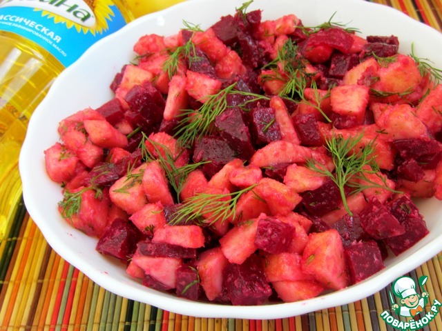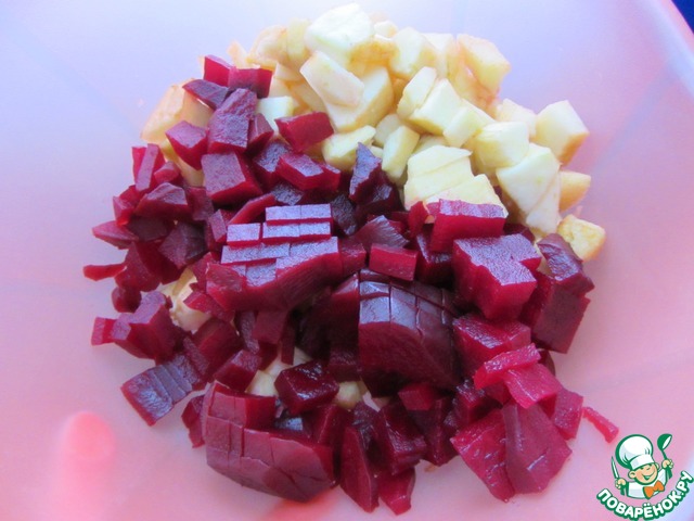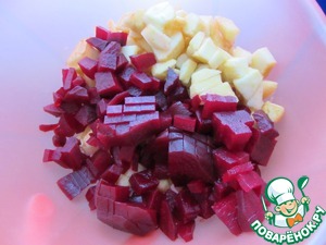 Яблоки и свеклу нарезать небольшими кусочками и выложить в салатник.
