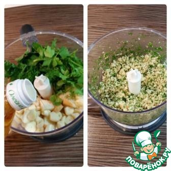 Для приготовления хлебной крошки: в чашу сложить порезанные на кубики булочки, чеснок, зелень, влить растительное масло, немного посолить и все пробить блендером до мелкой крошки.