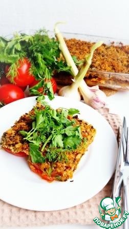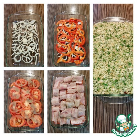 Жаропрочную форму или противень смазать растительным маслом. Уложить подготовленные ингредиенты слоями в следующем порядке: лук, перец, помидоры, филе рыбы, хлебная крошка. Между слоями посолить, поперчить. Разогреть духовку до 200 градусов, поставить форму, выпекать 40-45 минут.