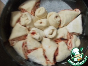 Каждый пласт промазываем нашей начинкой из сливы. Скручиваем рулетом каждый пласт.