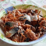 Морковь натереть на "корейской" терке, лук нарезать полукольцами, сбрызнуть овощи уксусом или лимонным соком, слегка помять руками. Добавить молотый чеснок. Соединить овощи с рыбой, перемешать.
