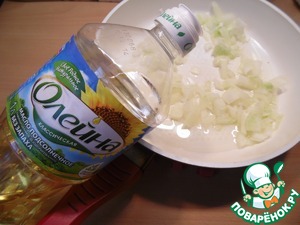 Лук мелко нашинковать, обжарить на растительном масле ТМ "Олейна" до золотистого цвета. Лук переложить в миску.