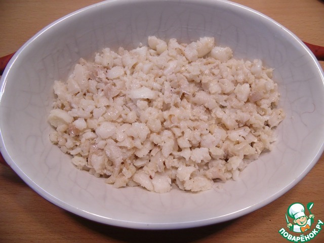 Треску нарезать небольшими кусочками, обжарить ее в сковородке, на которой жарился лук, разбивая на мелкие кусочки, 10-15 минут. Приправить солью и белым перцем.