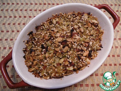Смешать обжаренный лук, киноа, булгур, семечки и кунжут.