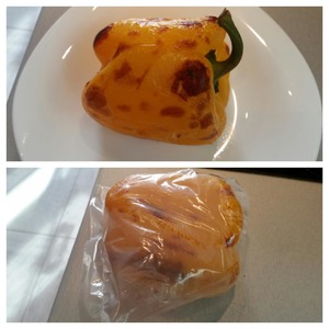 Пока варится киноа, запекаем в духовке перец. Для этого разогреваем духовку до максимума, запекаем перец на решетке примерно 10 минут. Может, больше, в зависимости от духовки, до подпалин. Готовый перец выкладываем на тарелку и накрываем пищевой пленкой (или кладем в пакет) минут на 5. Так легче его очистить.