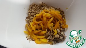Добавляем перец и киноа к грибам. Солим и перчим по вкусу.