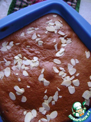 Готовое тесто густоты сметаны вылить в форму, присыпать миндальными лепестками и печь в разогретой до 180 градусов духовке до зарумянивания и сухой лучинки.