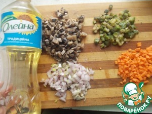 Приготовим овощи. Почистим и мелко порежем. Кабачок у меня замороженный, а грибы нужно предварительно проварить пару минут.