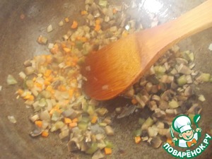 Затем добавляем кабачок и грибы и продолажаем обжаривать буквально несколько минут.