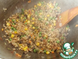 Затем добавляем горошек с кукурузой и перловку, досаливаем по вкусу, перчим и накрываем крышкой, тушим до готовности и мягкости на медленном огне, периодически помешивая.