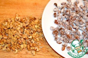 Орехи крупно порубить. Изюм промыть, обсушить и обвалять в муке.