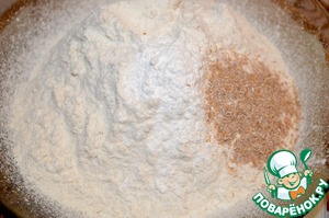 Муку просеять и смешать с разрыхлителем и отрубями.