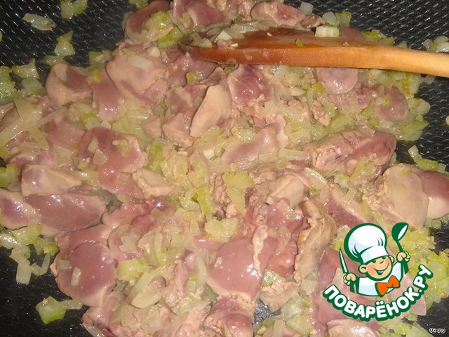 Промойте куриные печенки и просушите их бумажным полотенцем, затем добавьте их к луку и сельдерею, прожарьте 2-3 минуты. -
