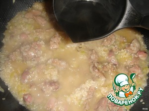 Постепенно, половник за половником, добавляйте кипяченную с душистым перцем воду, постоянно помешивая. Кастрюльку с водой лучше держать на маленьком огне, так как добавляемая жидкость должна быть горячей.