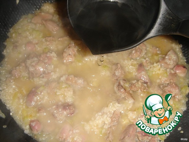 Рис должен впитывать жидкость, а не плавать в ней, поэтому не следует сразу наливать несколько половников жидкости. Весь процесс приготовления должен занять около 20 минут. -