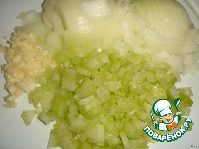 Слегка обжарьте лук, чеснок и сельдерей до прозрачности лука.