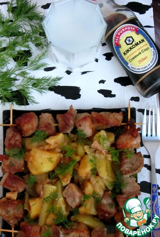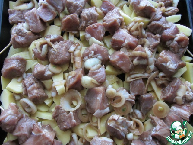 Картошку очистить, нарезать. Уложить картофель на смазанный маслом противень, посолить, а сверху выложить мясо. Можно нанизывать на смоченные водой шпажки, а можно выложить просто поверх. Я сделала 50/50.