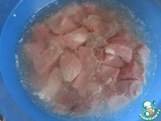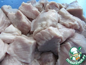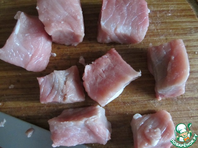 Мясо промыть и обсушить. Лучше, конечно, использовать вырезку, например, шею. Нарезать на небольшие квадратики.