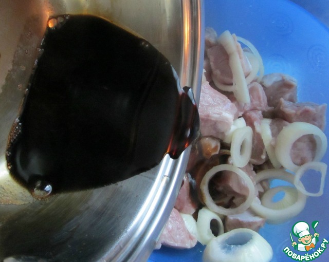 Лук нарезать кольцами и добавить к мясу. Посолить мясо и залить соевым соусом. Соусом заливать сразу с плиты.