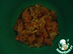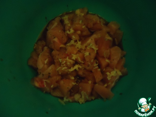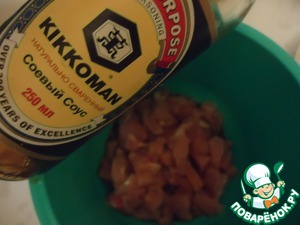 • Куриную грудку сложить в чашу, добавить соевый соус, специи.