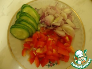 • Пока мясо маринуется, нарезать овощи: перец- кубиками, лук мелко нарезать, огурец- кружочками.