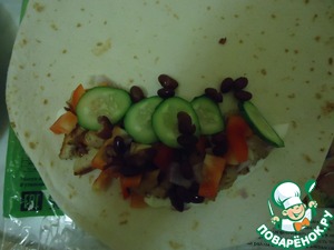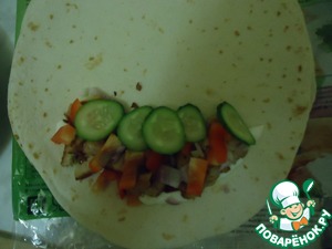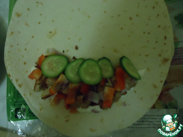 • Сверху положить куриное мясо, лук, перец, огурец.