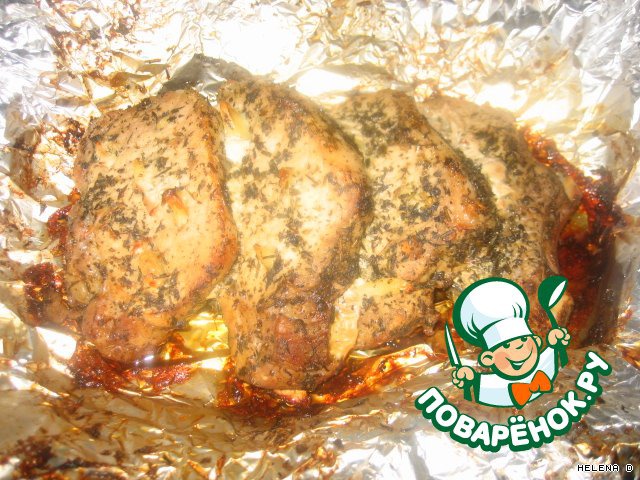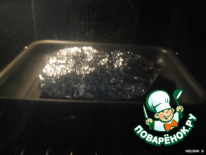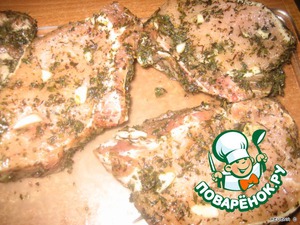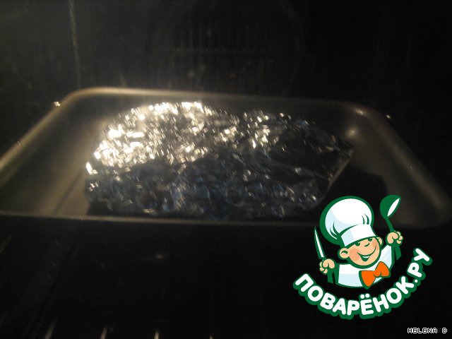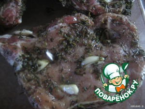 Готовим маринад и маринуем наше мясо примерно 1 час, после маринования разрезанные зубчики чеснока вставляем в куски мяса, заворачиваем фольгу и отправляем в разогретую до t 180гр. духовку на 50-60 мин.