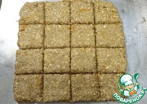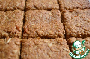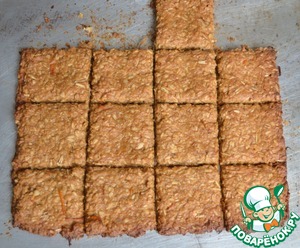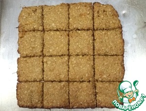 За час тесто настоялось, стало гораздо плотнее. Берём его, раскатываем на противене не очень тонко, примерно 6-7 мм толщиной. Стараемся раскатать тесто квадратом. Аккуратно нарезаем квадрат на печеньки. У меня получилось 16 печенек. Ставим противень в духовку при температуре 150 градусоа на 15-20 минут.