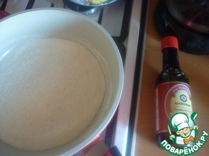 Когда сахар начнёт карамелезироваться, добавить тонкой струйкой сладкий соевый соус. Если у Вас получатся кристаллики, не переживайте, они потом исчезнуть. Снять с плиты. -