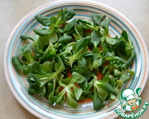 Перед подачей, листья зеленого салат вымыть и обсушить. Выложить на сервировочное блюдо.
