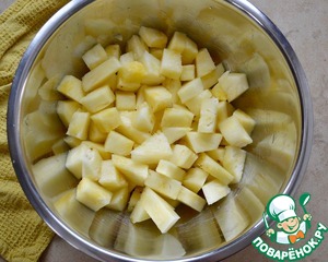 Ананас очистить и нарезать небольшими кусочками. Выложить в миску.