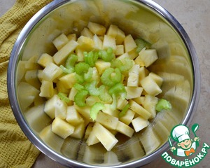 Стебель сельдерея нарезать потоньше и добавить к ананасу.