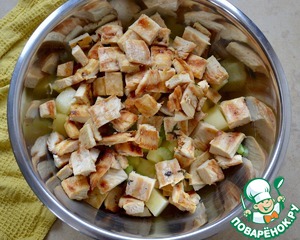 Курицу нарезать также кусочками, примерно одинакового размера с ананасом. Выложить в миску.