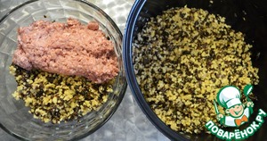Разделяем начинку на две части. В одну добавляем фарш из говядины и свинины.